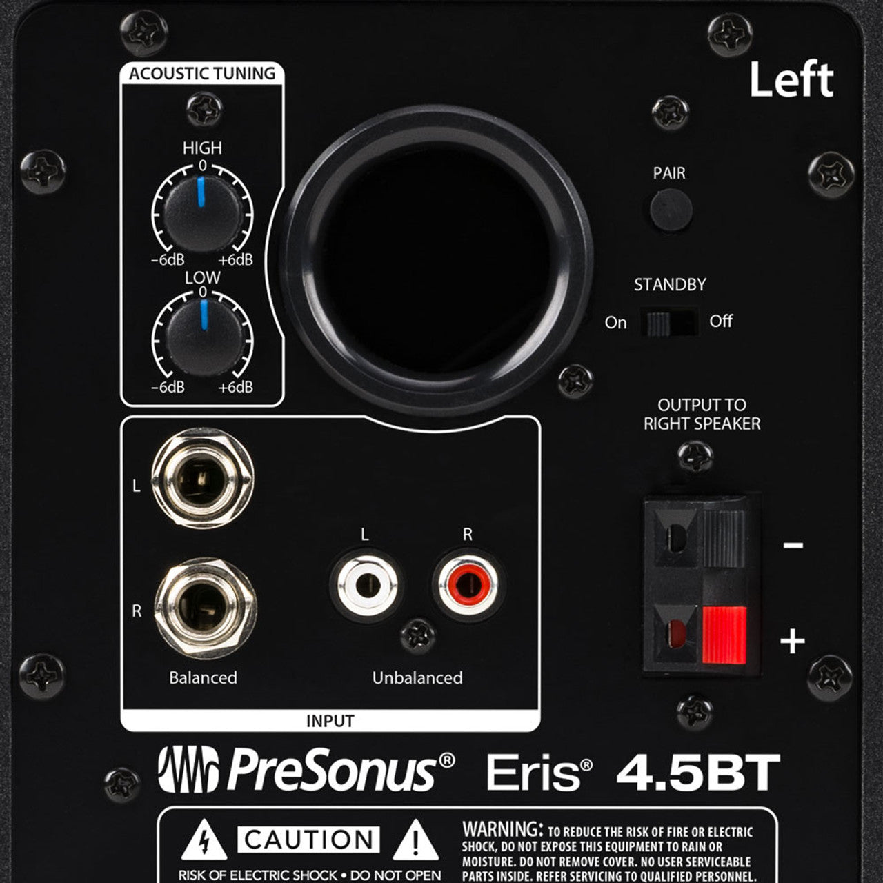 A convenient front-panel knob sets the level of both the power amp and the loud, clear headphone amplifier, with its front-panel jack. With four types of inputs, including fast, reliable, stereo Bluetooth® 5.0 connectivity, it's easy to connect just about any audio source to your Eris 4.5BT reference monitors. High- and low-frequency controls let you easily adjust your Eris speaker's frequency response to compensate for the acoustics of your space and create the most accurate sonic reproduction possible.